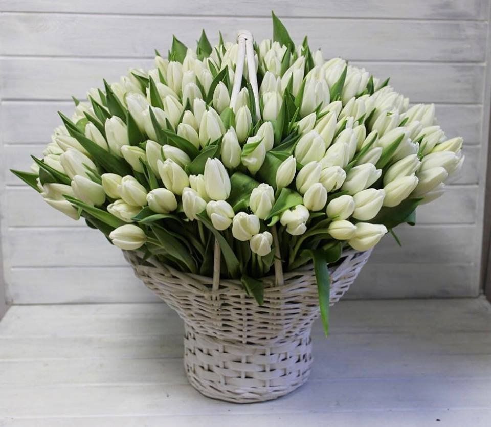 Белоснежная волна из полутора сотен бутонов заполняет корзину плотным живым массивом. Тюльпаны собраны так, что каждый стебель находит своё место в общей композиции. Чистота линий и монохромность создают впечатление весеннего сугроба.