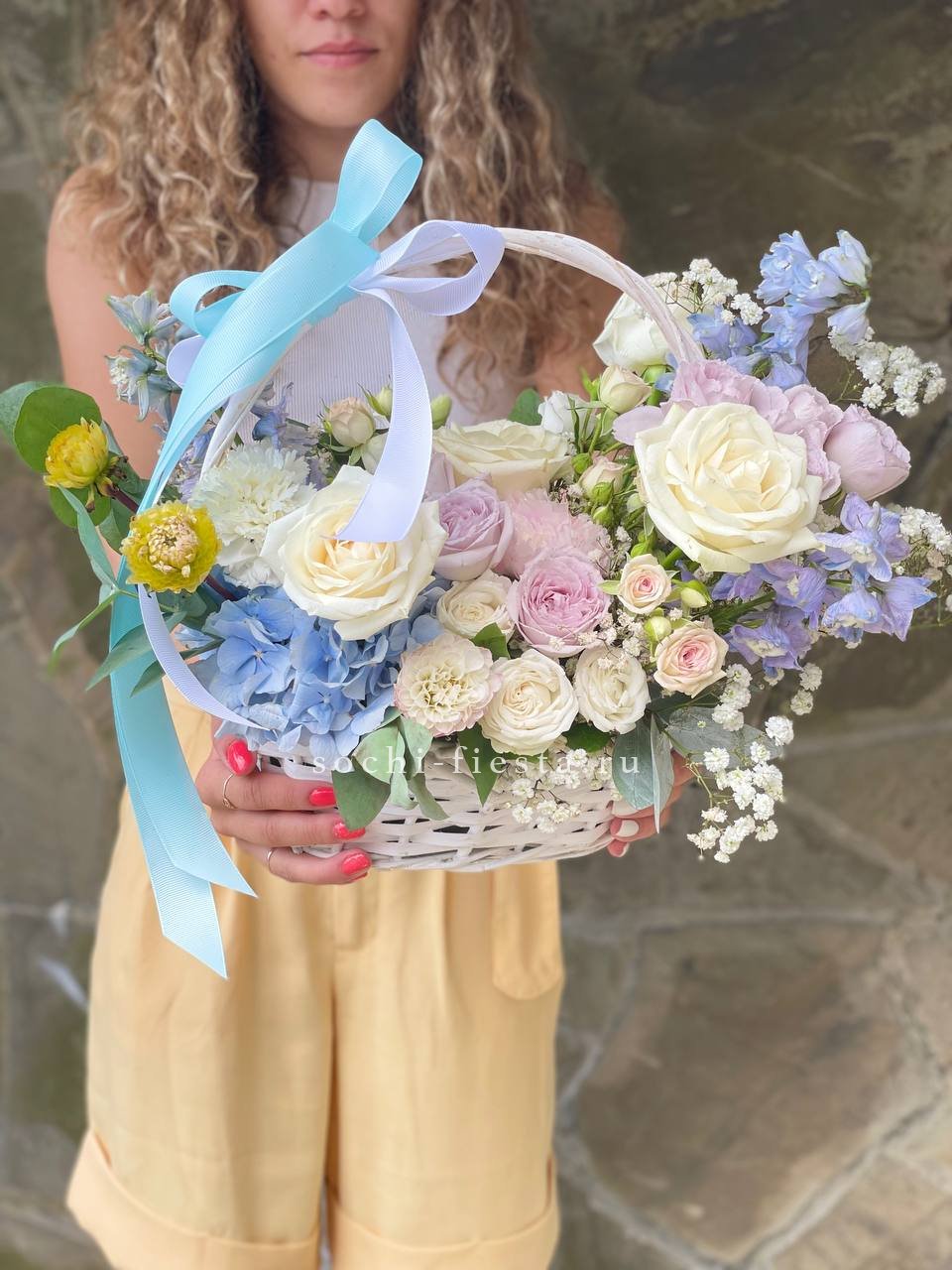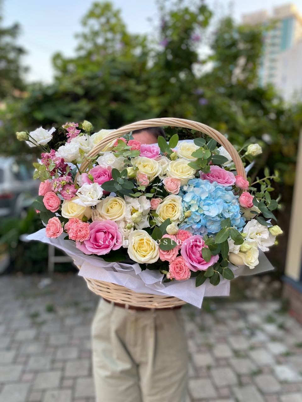 розы, эустома, гортензия, бомбастик, маттиола ( или аналог), эвкалипт, корзина.