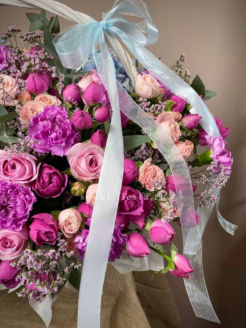 розы одноголовые, розы кустовые, эустома, фисташка или эвкалипт, пиафлор, лента, корзина D35.