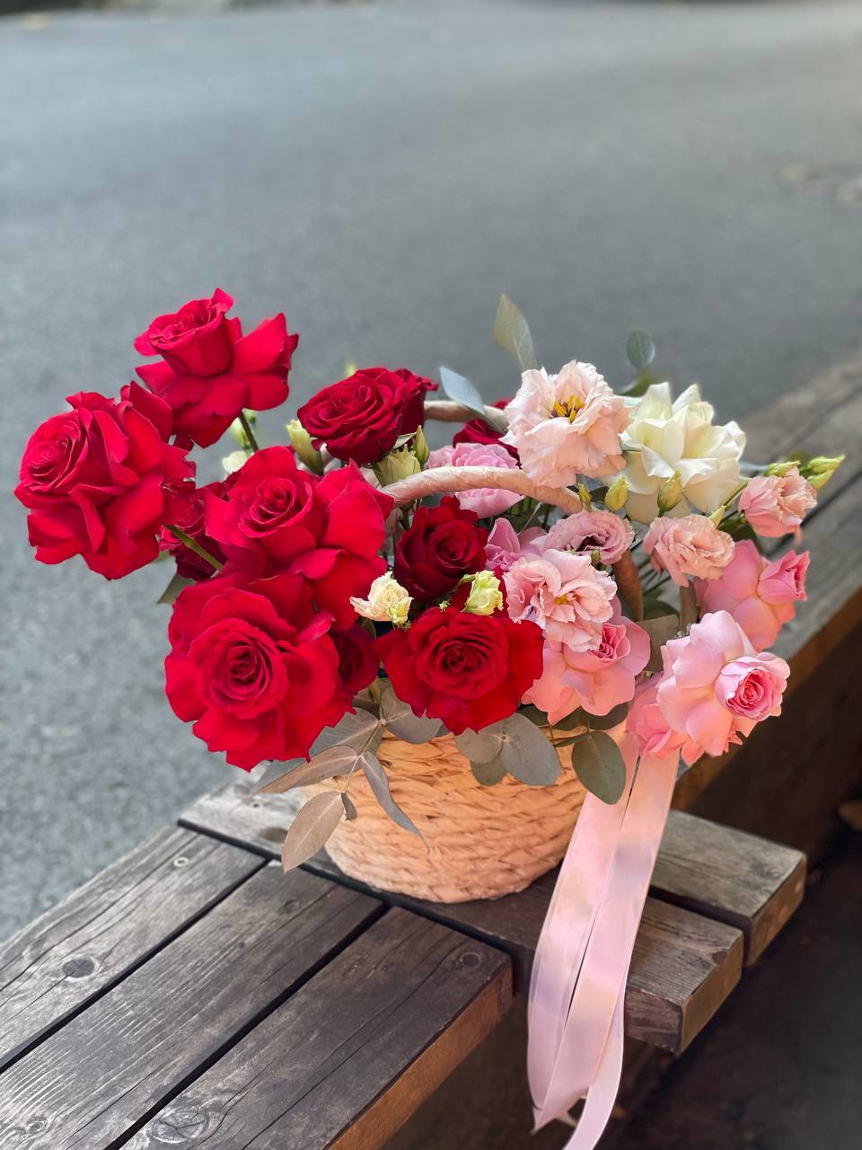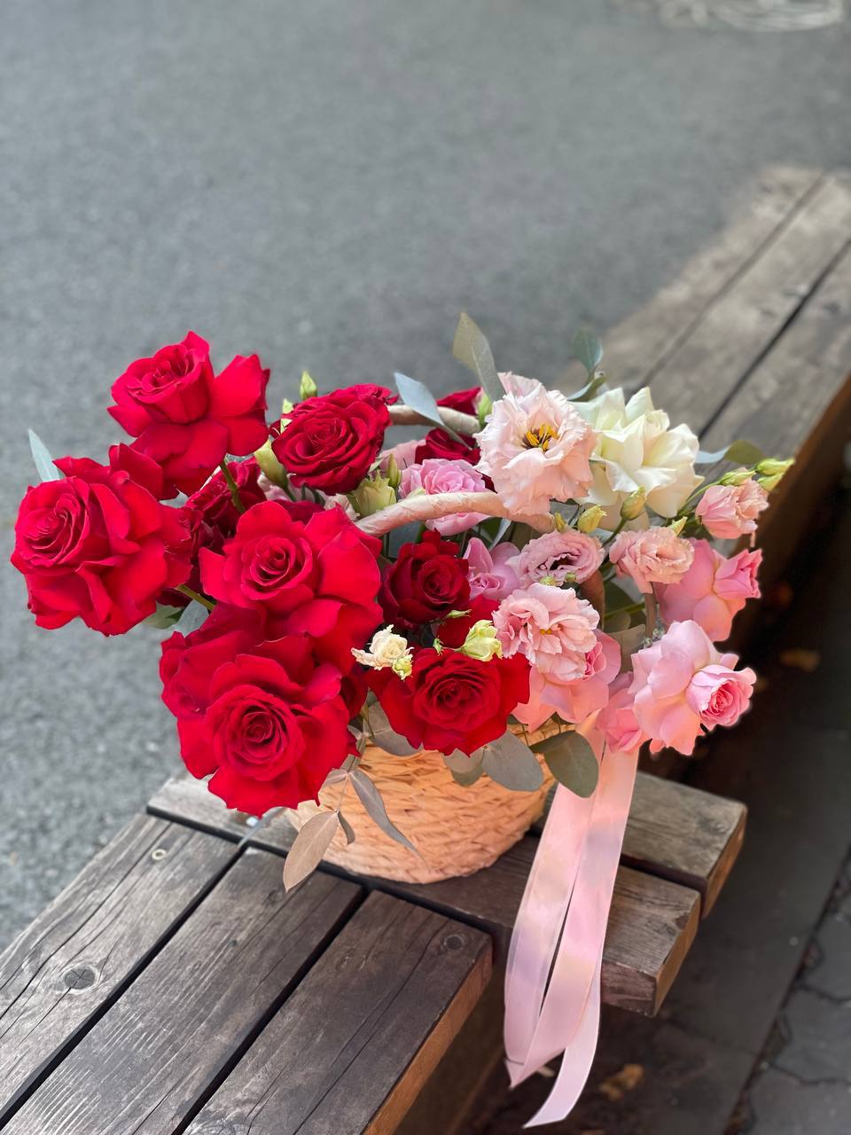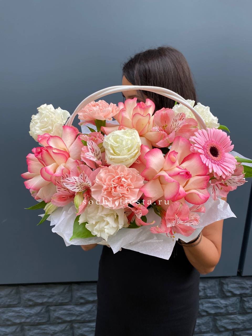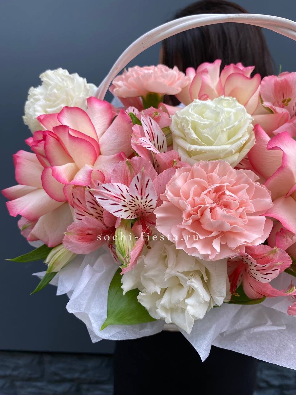 Пышная корзина объединяет пионовидные розы с воздушной гортензией и многослойной эустомой. Матиолла и лимониум добавляют глубину композиции, а диантус создает мягкие переходы между крупными бутонами.