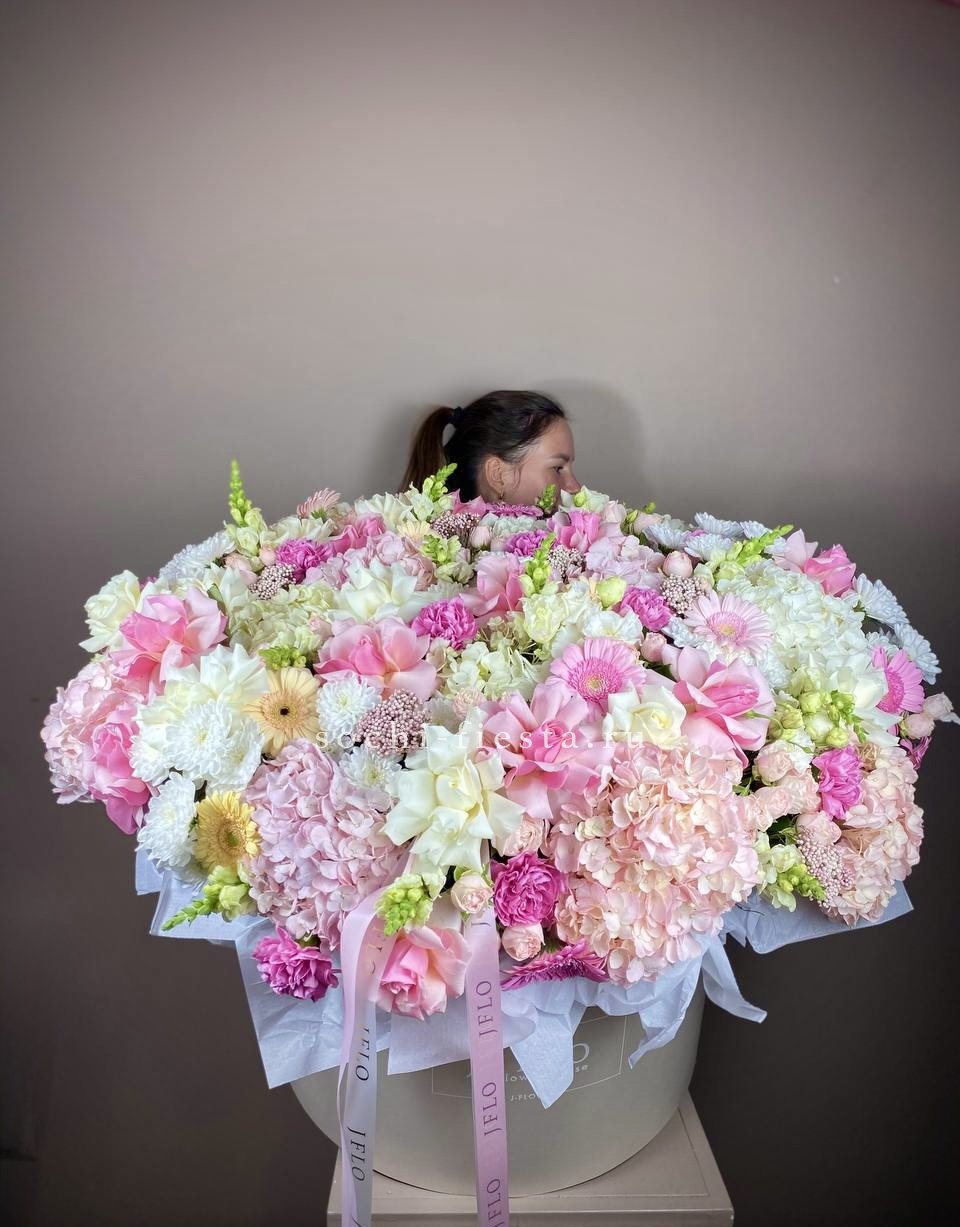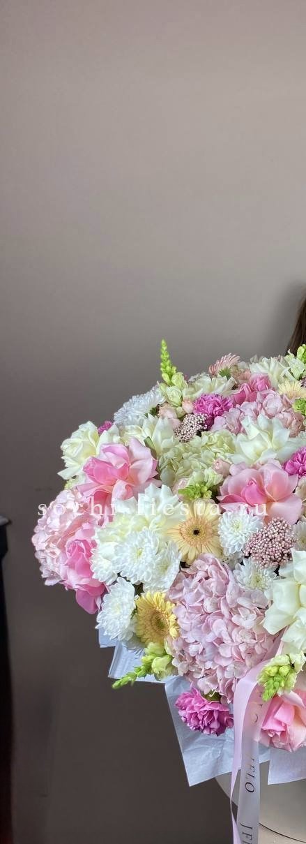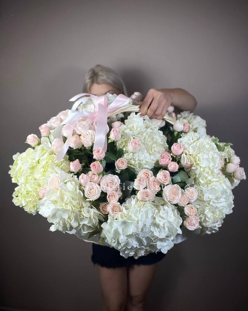 Здесь идеально сочетаются крупные, бархатистые бутоны роз, облака гортензии и мелкие акцентные цветы. Получилась невероятно воздушная и легкая композиция, которая мгновенно создает ощущение праздника и весеннего настроения. Стильный бант завершает этот изысканный образ.