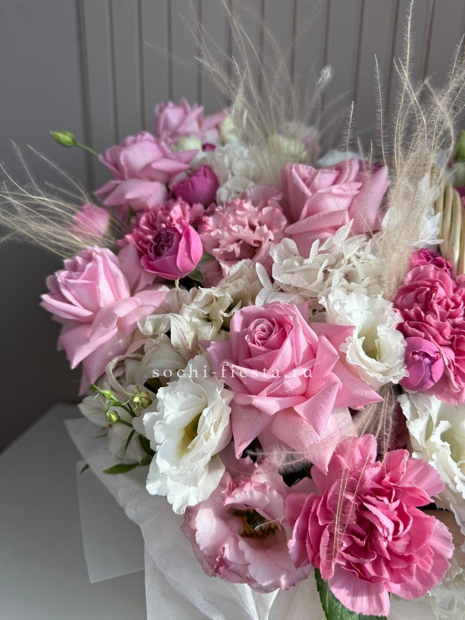 Сорок одна пионовидная роза в светлой корзине выстраивает объёмную композицию с мягкими переливами лилового и розового. Эвкалипт обрамляет густую россыпь бутонов.