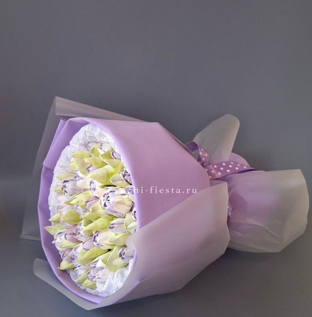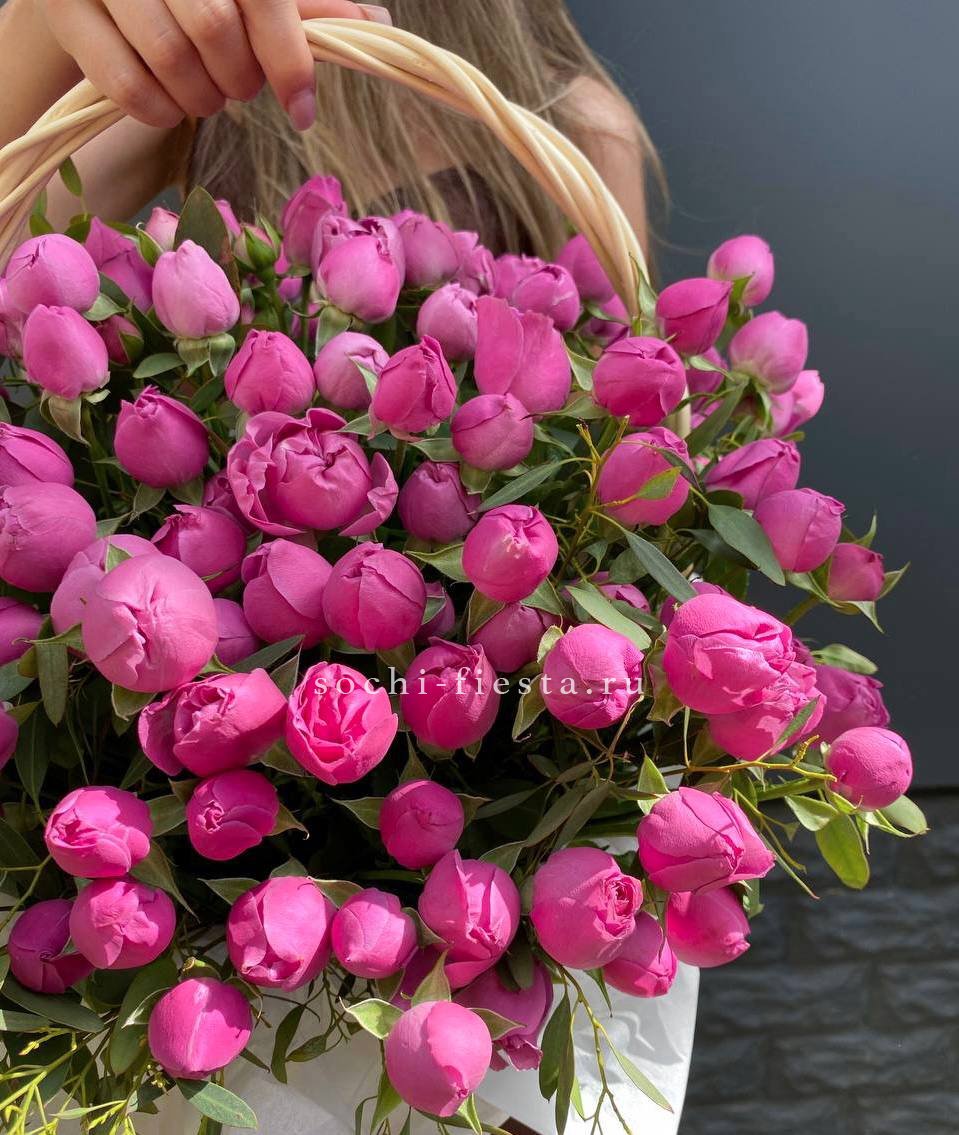 Пятьдесят один бутон Мисти Баблс собраны в плетёную корзину и образуют плотную цветущую полусферу. Лавандовые оттенки раскрываются постепенно и держат форму долго.