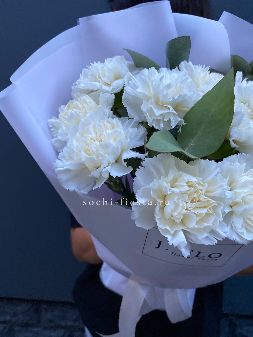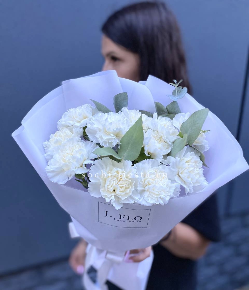 15 белых диантусов,ковыль,лагурус, эвкалипт, лента, дизайнерская пленка.