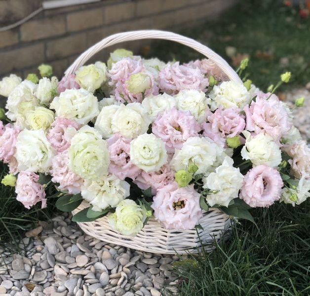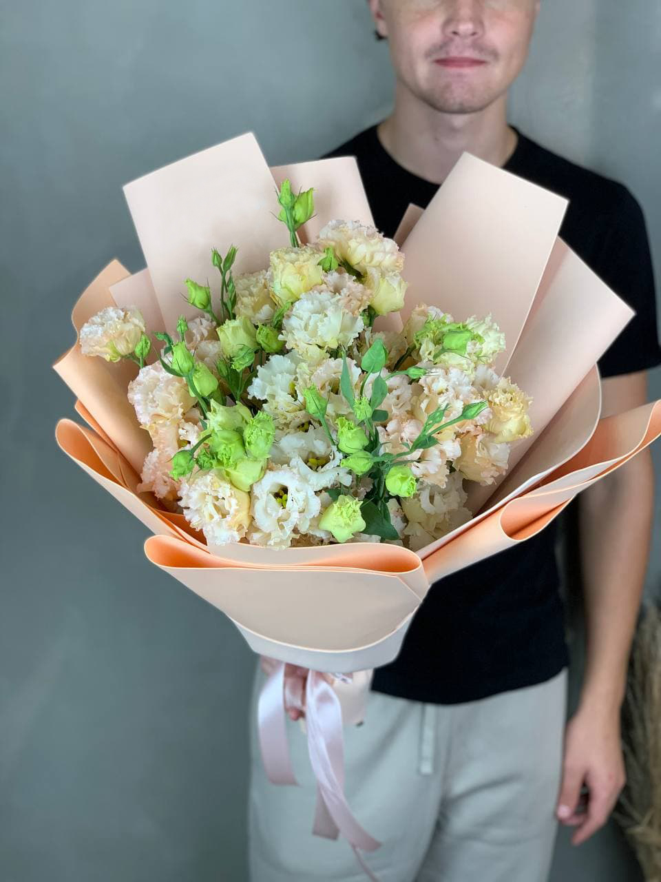 Двадцать пять веточек эустомы собраны в пышный букет и перевязаны лентой. Многослойные бутоны создают воздушный объём и мягкую игру оттенков. Классическая подача для тех, кто ценит естественную красоту цветка.