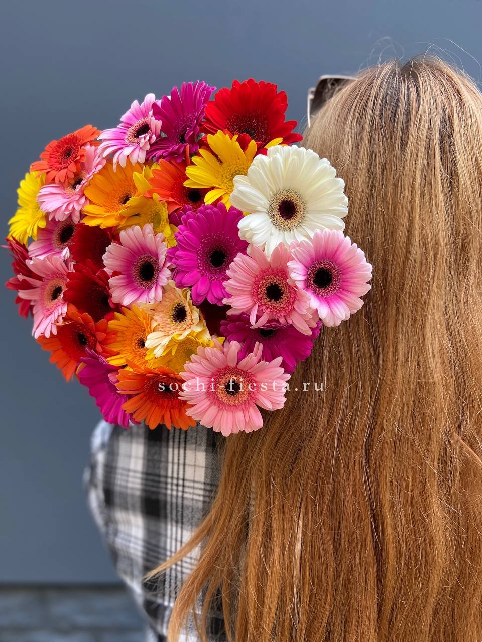 Охапка разноцветных гербер впечатляет масштабом и насыщенностью палитры. Множество раскрытых бутонов создаёт объёмное цветовое пятно, которое мгновенно преображает пространство вокруг.