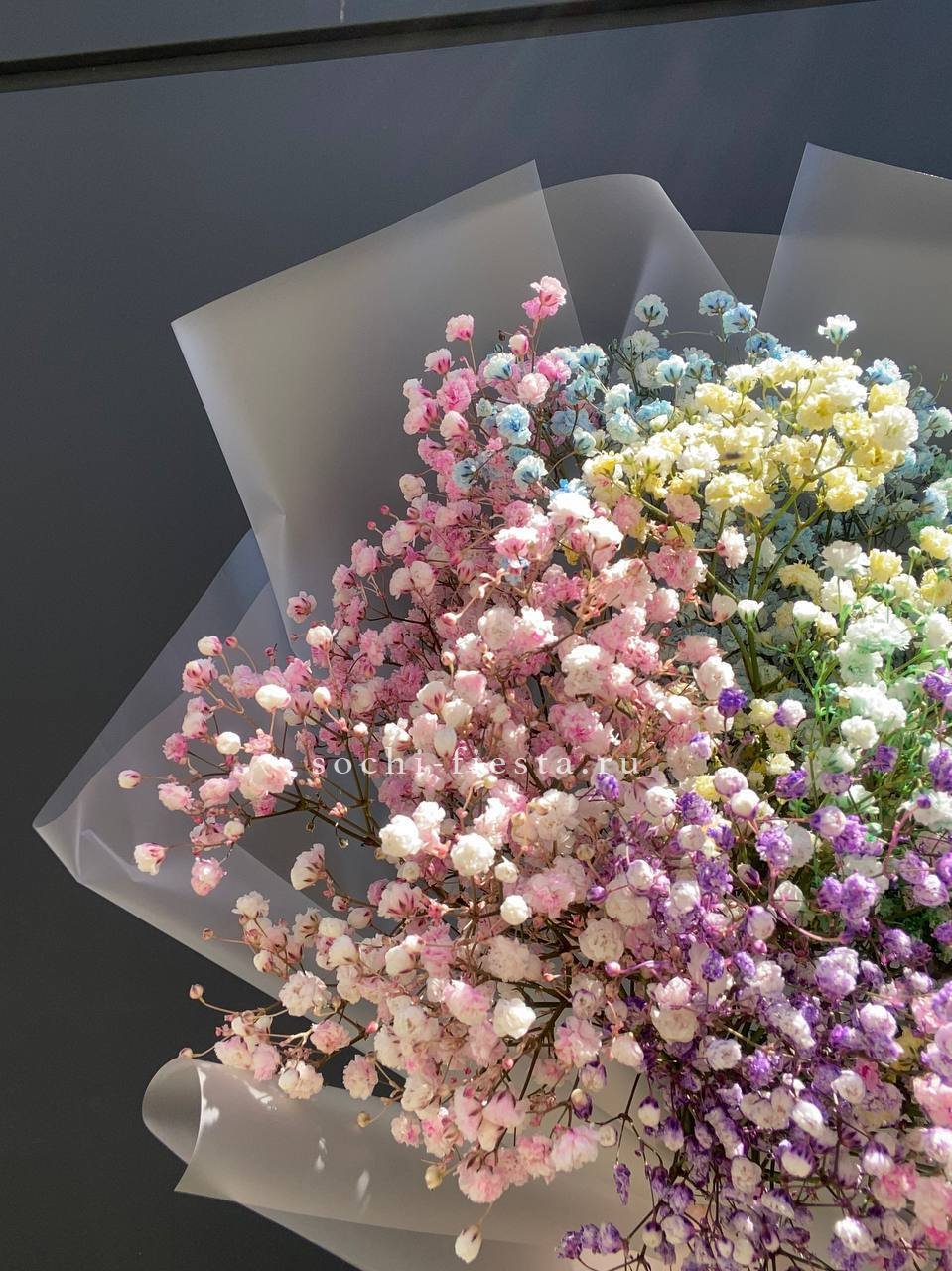 7 радужных голландских гипсофил, лента, комбинированная упаковка.