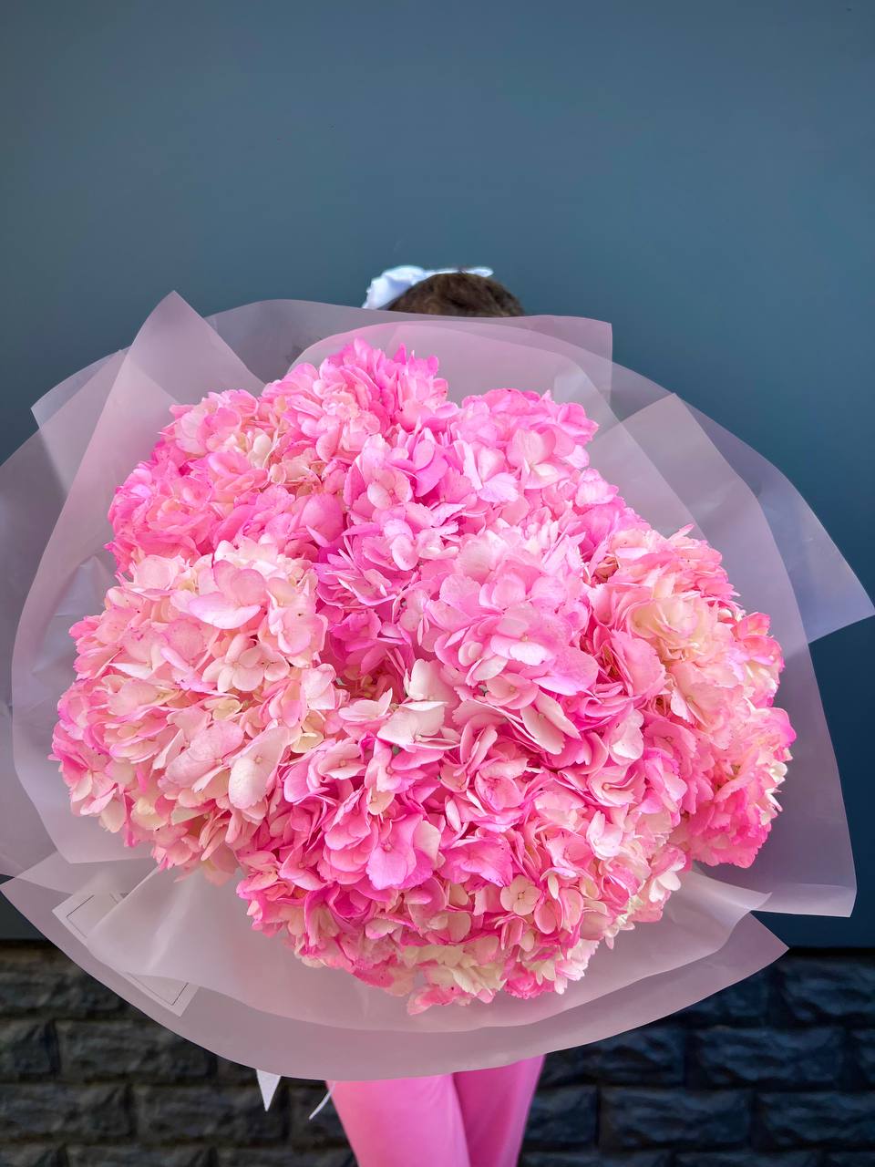 Девять пышных соцветий розовой гортензии собраны в объёмный букет с мягким градиентом оттенков. Каждая головка раскрыта полностью, создавая плотное облако лепестков.