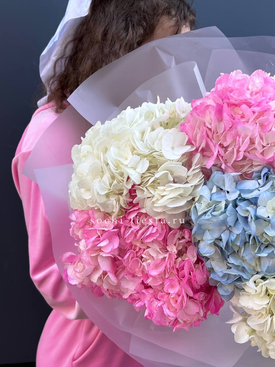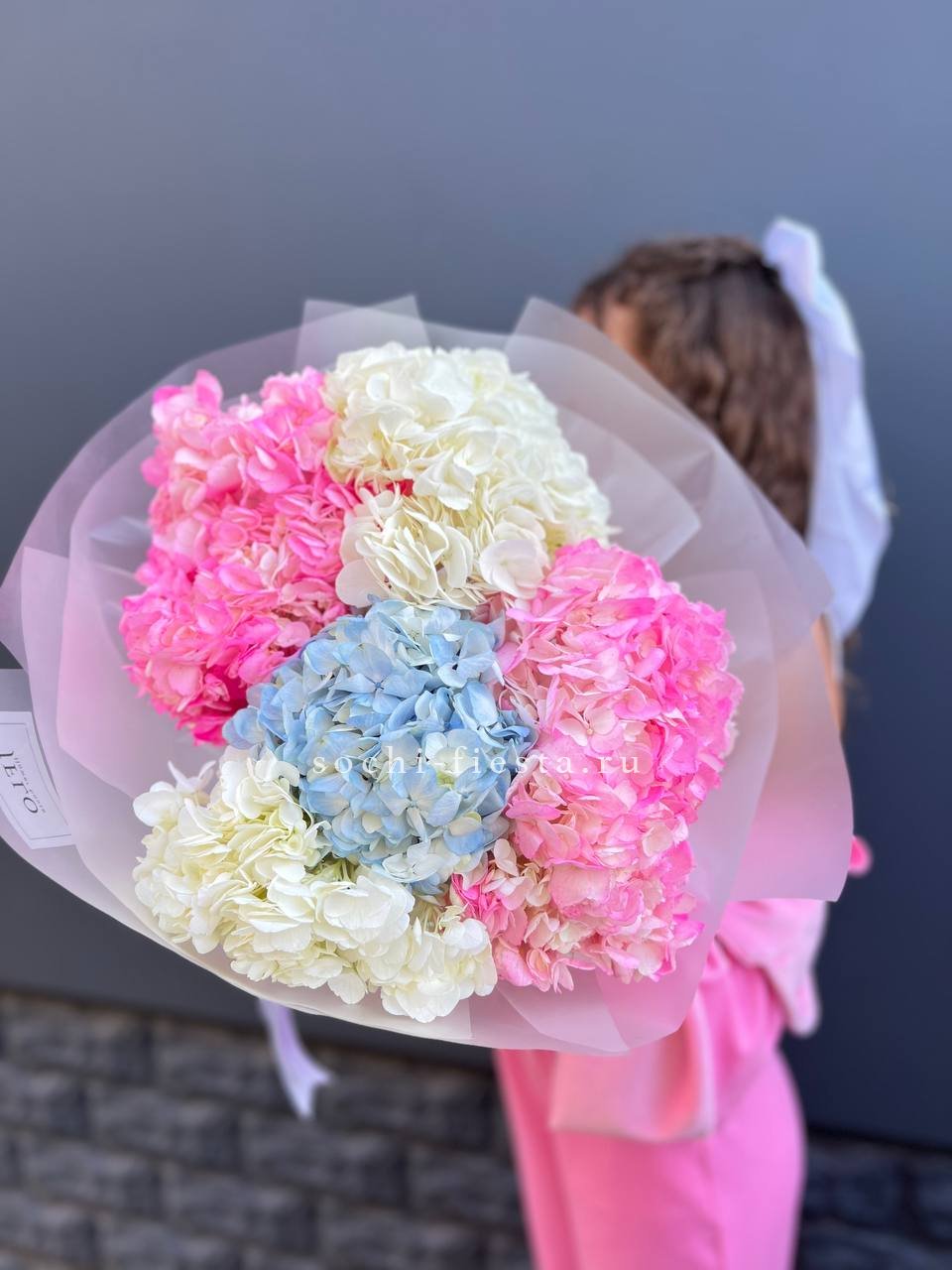 гортензия розовая 9шт., лента, дизайнерская упаковка. Цвет гортензий может незначительно отличаться.