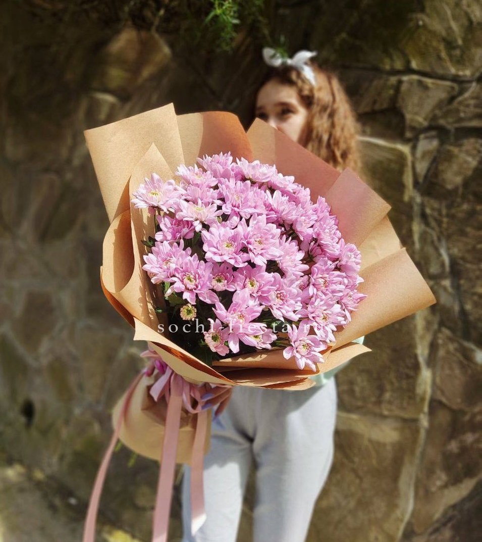 Одиннадцать веток розовой кустовой хризантемы в натуральном крафте. Множество соцветий формируют пышный объем, а естественная подача сохраняет лёгкость и воздушность композиции.
