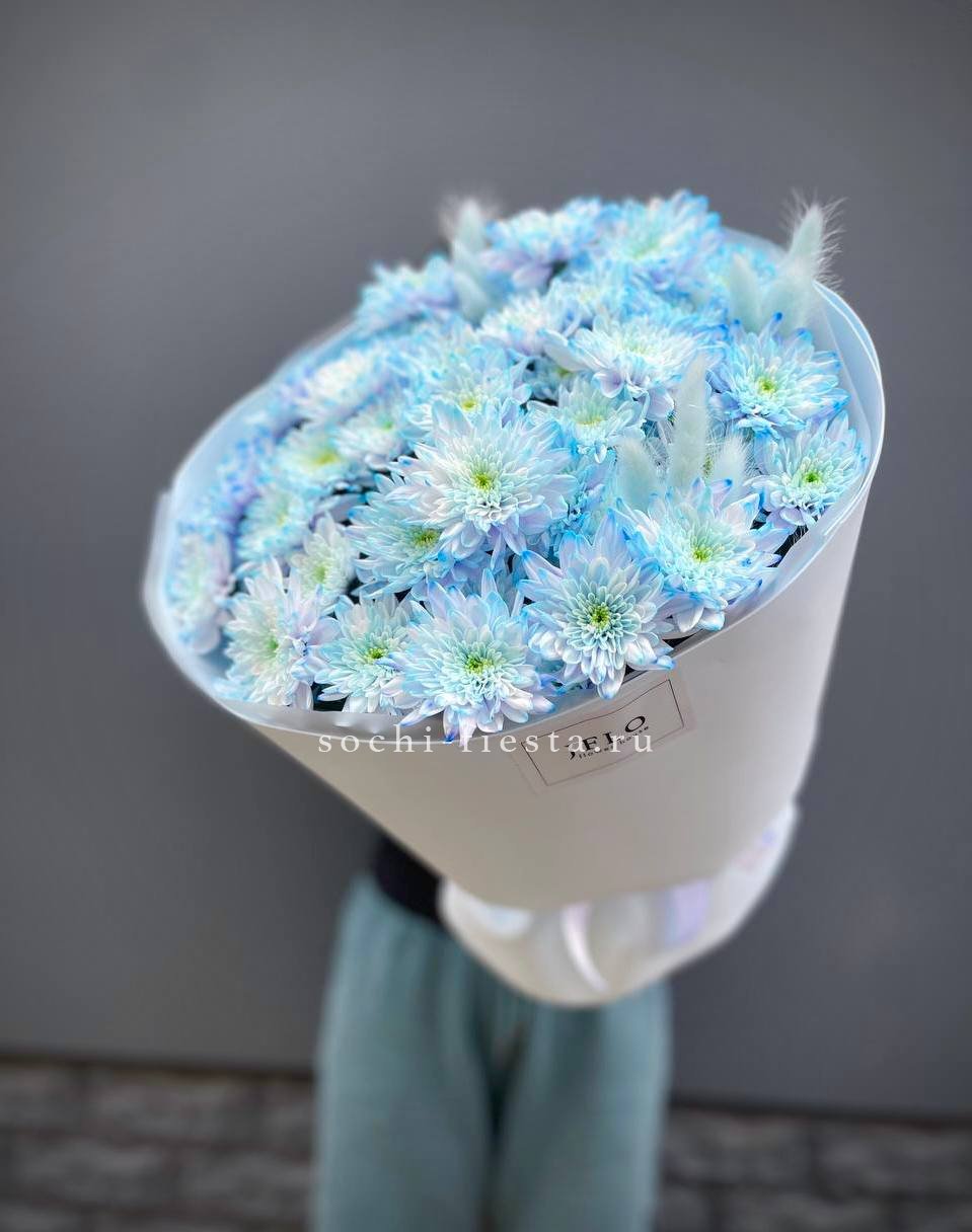 Девять веток кустовой хризантемы в пастельном голубом тоне дополнены пушистым лагурусом. Мягкая цветовая гамма и воздушная текстура создают спокойное визуальное впечатление.
