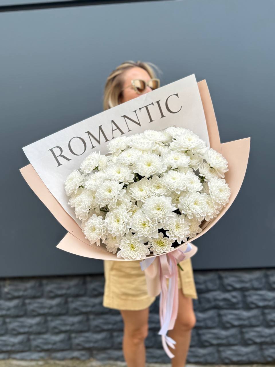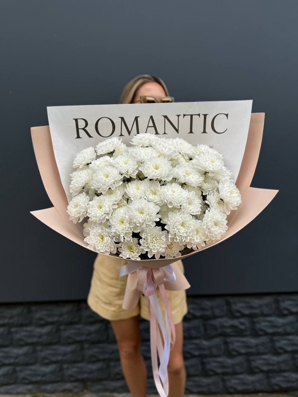 хризантемы - 7 шт, эвкалипт,  лента, дизайнерская упаковка.