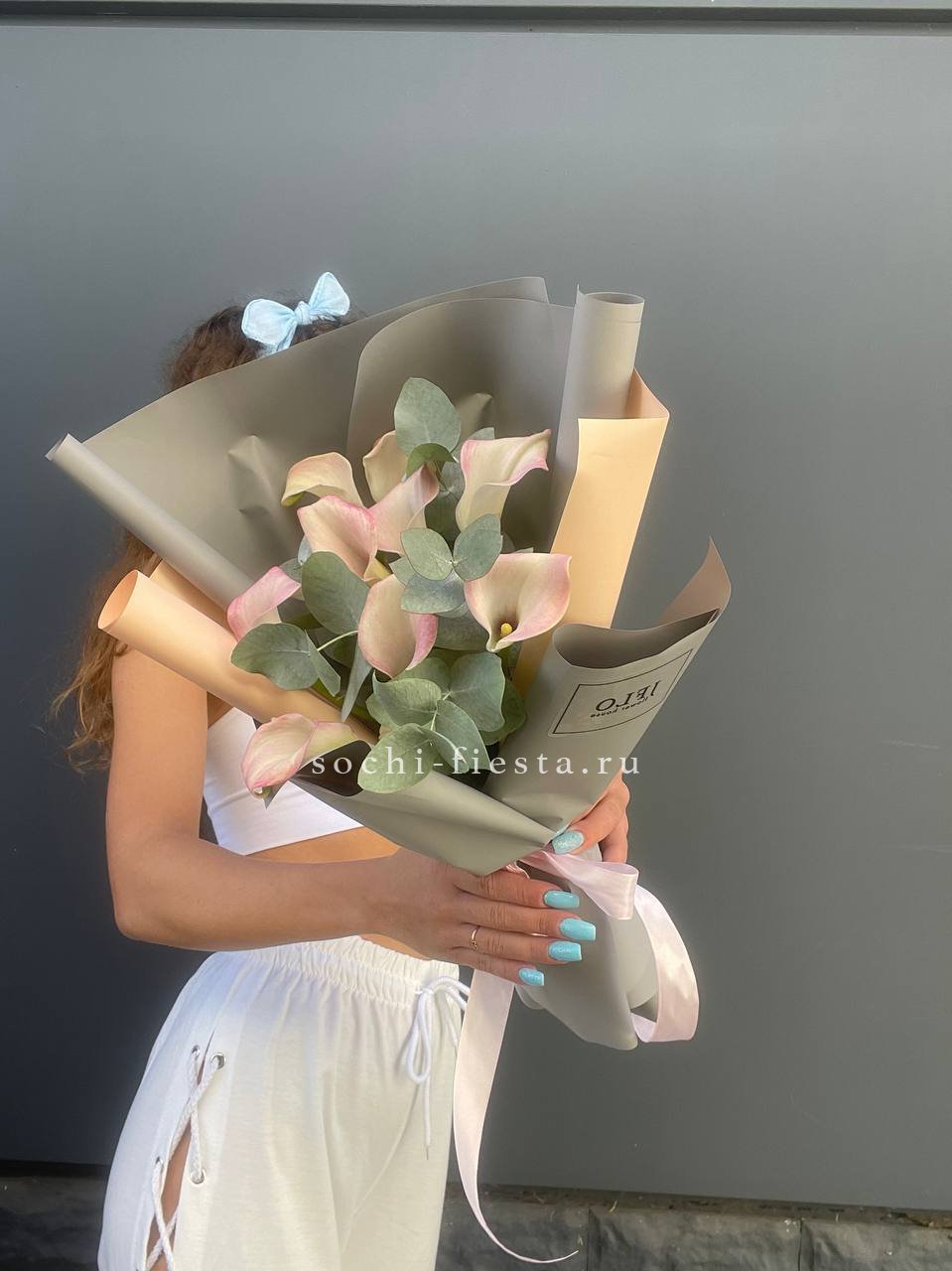 Девять калл собраны в плотную вертикальную композицию с графичными линиями стеблей и строгими соцветиями. Декоративная зелень добавляет объём, сохраняя лаконичность формы. Букет для тех, кто ценит выразительность без лишних деталей.
