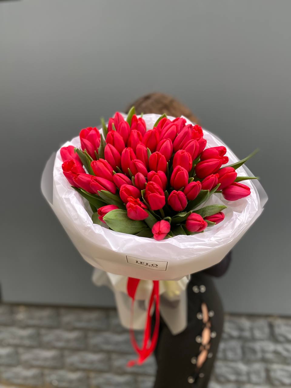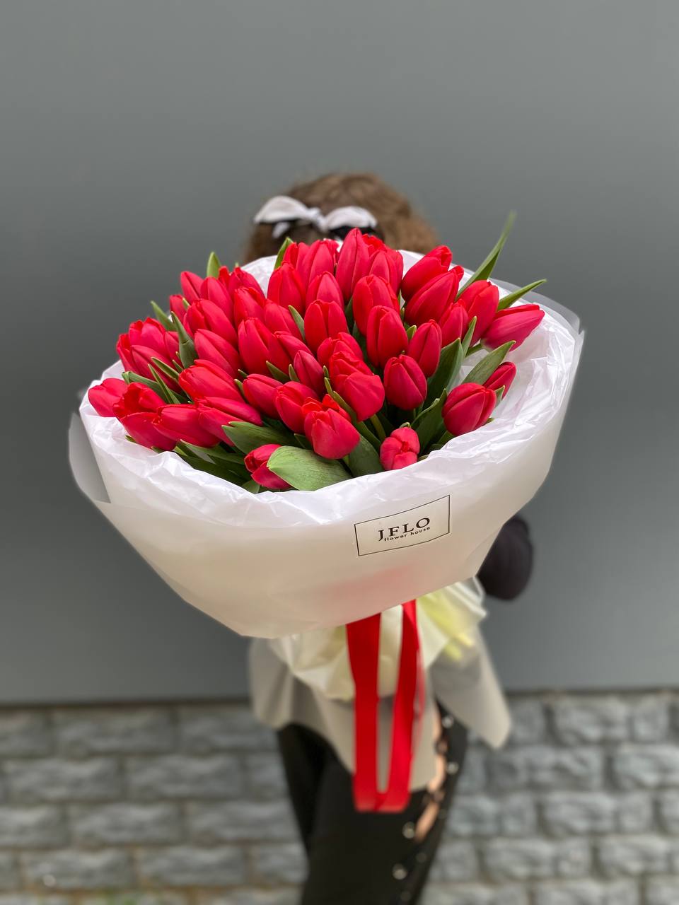 Пятьдесят один тюльпан собраны в плотную округлую форму. Белые бутоны создают объёмное облако с чёткими краями. Монохромная композиция заполняет пространство спокойной энергией.