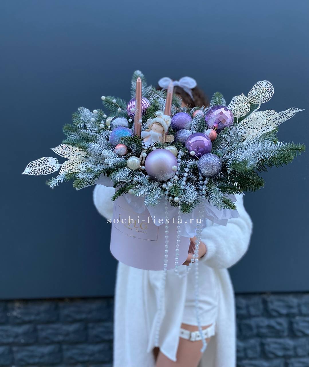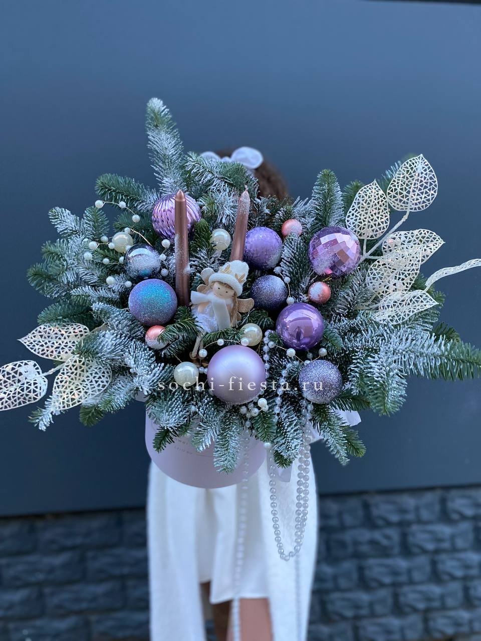 Ветки нобилиса обрамляют свечи и новогодние игрушки, создавая вертикальный силуэт с плавными переходами. Композиция выстроена так, что взгляд движется от основания к верхушке. Форма держится плотно и аккуратно.