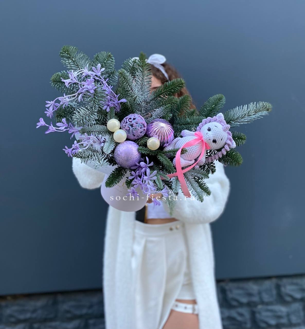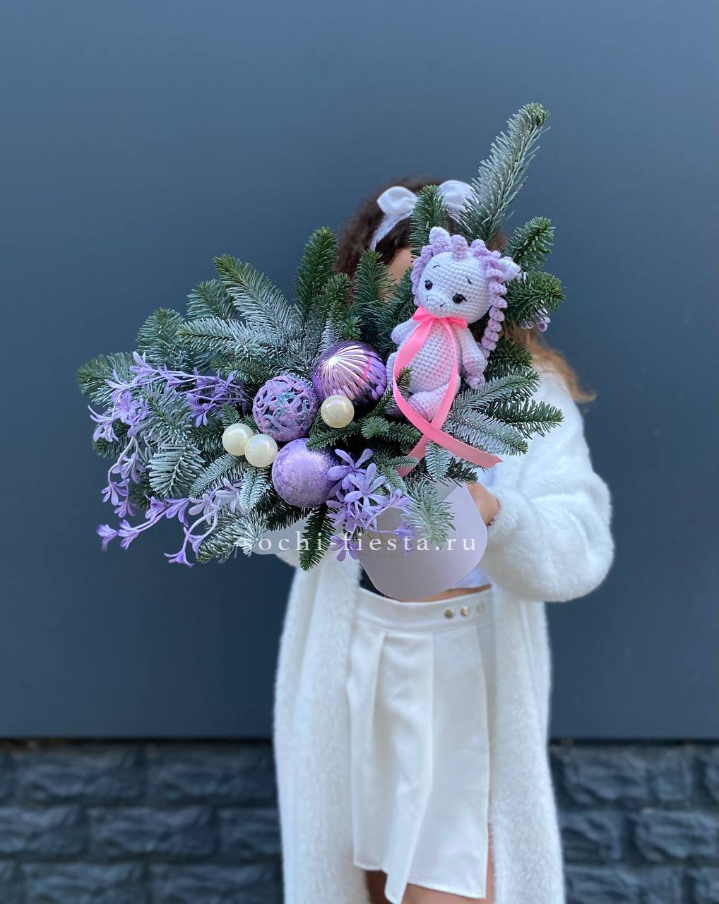 Пышная зелень нобилиса обрамляет фигурку единорога и праздничные украшения. Композиция выстроена в цилиндре на флористической основе. Яркие шары добавляют цветовых акцентов между ветвями.