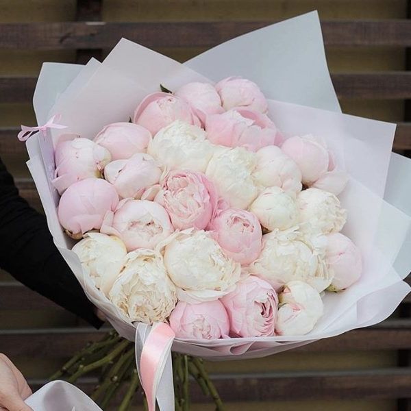 Двадцать девять пионов формируют объемную композицию с выразительной высотой. Плотное расположение бутонов создает динамичный ритм и визуальную глубину. Комбинированная упаковка завершает общий силуэт.