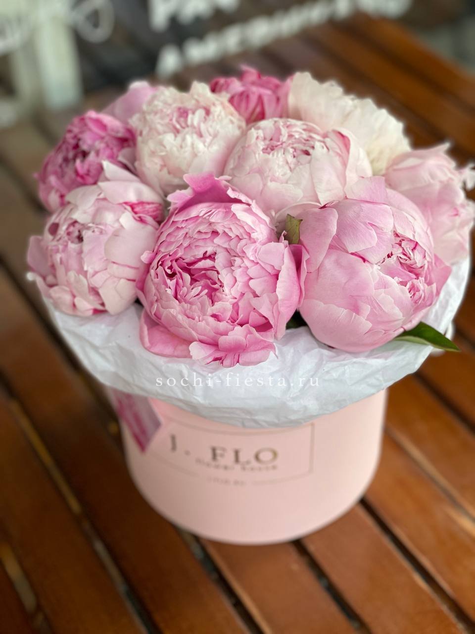 Девять пионов собраны в округлую композицию с мягкими переходами между бутонами. Атласная лента завершает силуэт и придаёт цилиндру завершённость.