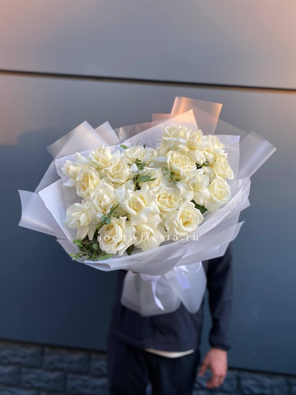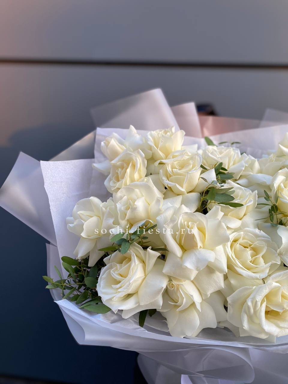 Тринадцать белоснежных бутонов собраны в компактную форму с ровным силуэтом. Букет легко размещается в вазе и сохраняет свежесть долгое время благодаря плотным лепесткам.