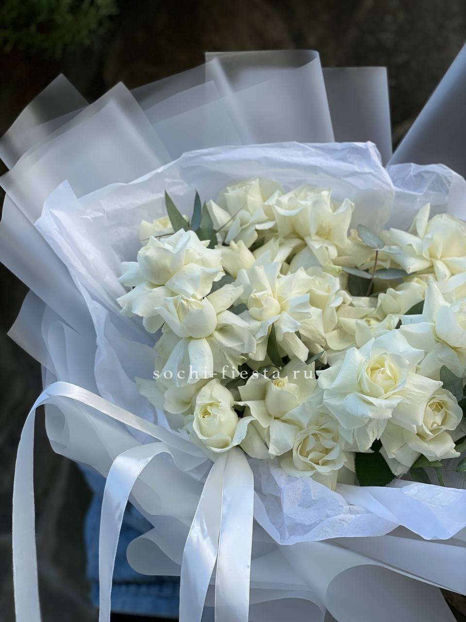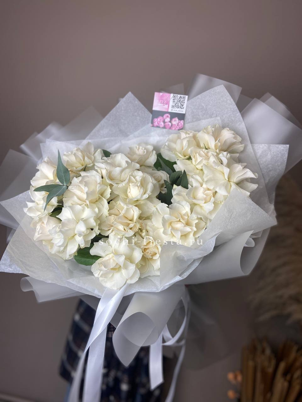 Вывернутые лепестки французских роз Notte Bianca раскрываются широко и создают объемную текстуру. Двадцать пять бутонов в окружении эвкалипта выглядят современно и графично.