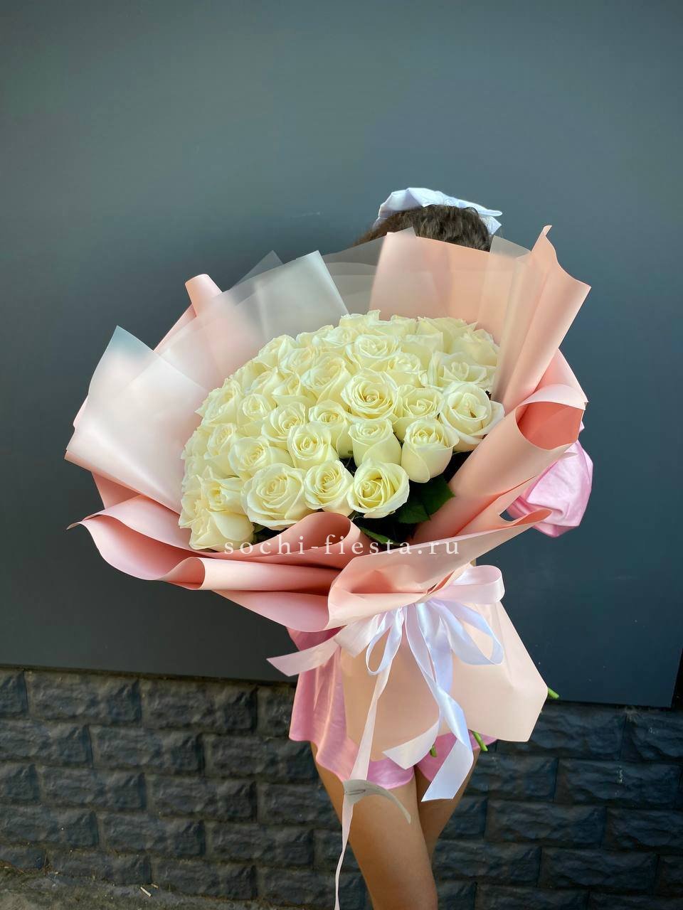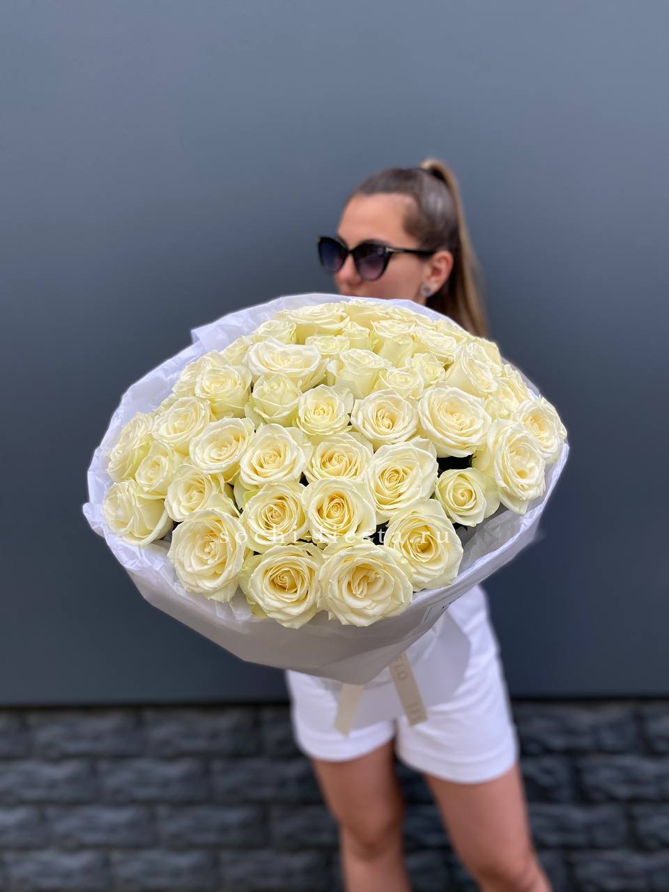 Тридцать пять белых бутонов образуют плотный монохромный ансамбль. Классическая форма и чистота оттенка позволяют букету звучать самодостаточно в любом интерьере.