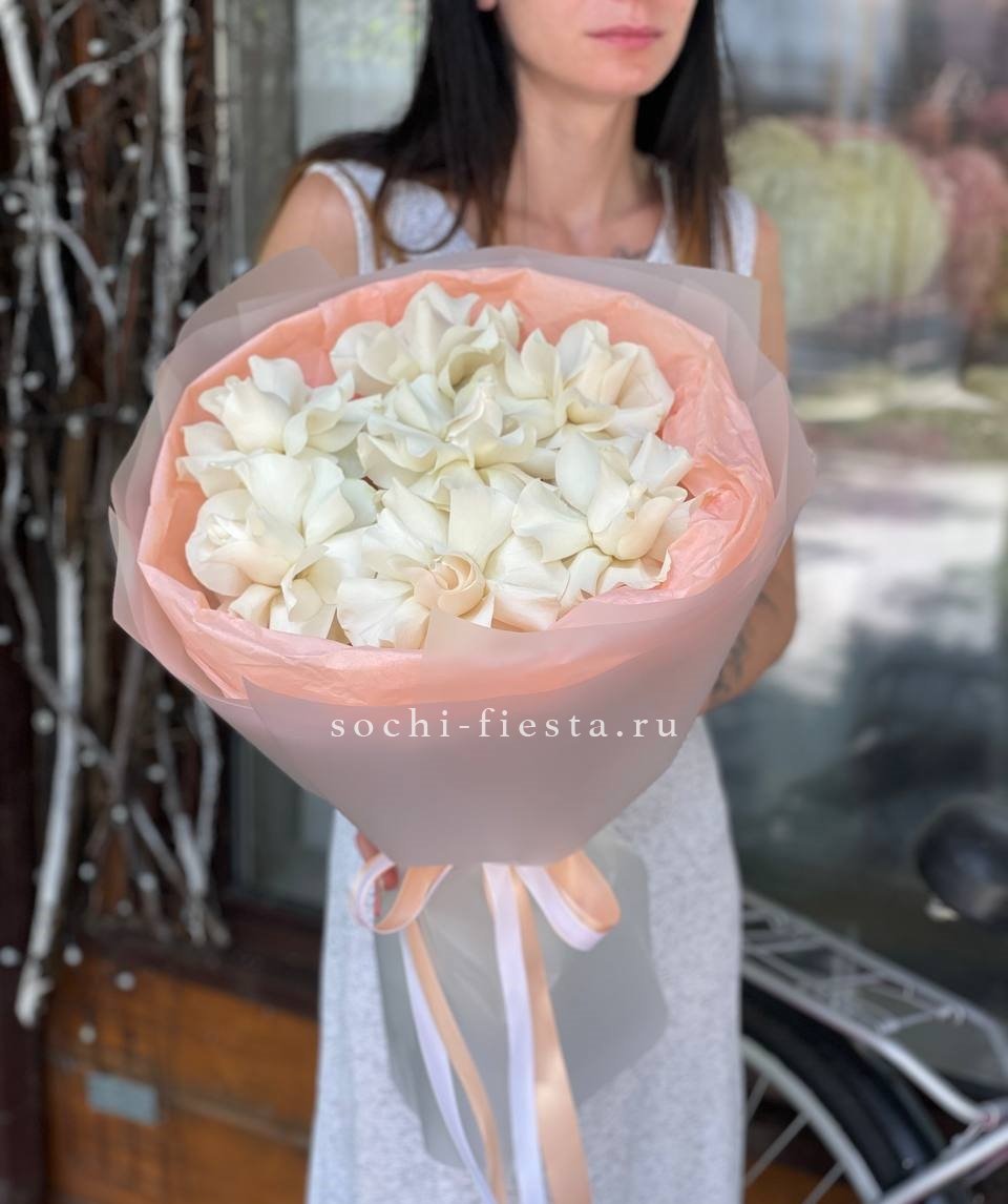Тридцать семь белых французских роз собраны в круглый бокс с ветками эвкалипта. Плотная укладка бутонов создает объемную композицию, где каждый цветок виден и держит форму. Безупречное решение для яркого события.