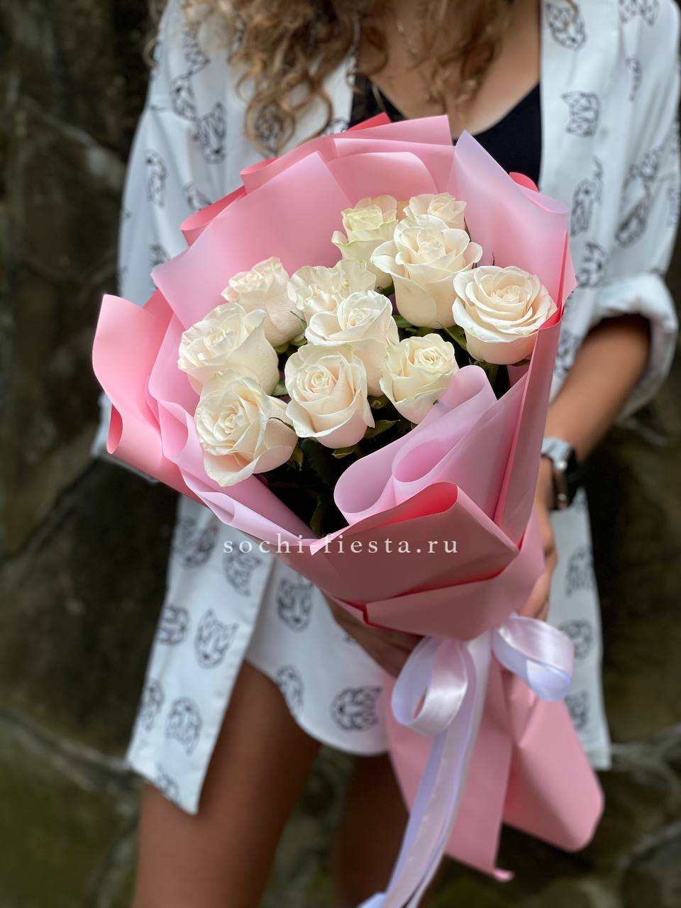 Пятнадцать белоснежных роз собраны в аккуратную форму с ровным силуэтом. Композиция сохраняет свежесть и держит структуру благодаря продуманному размещению бутонов в цилиндре.
