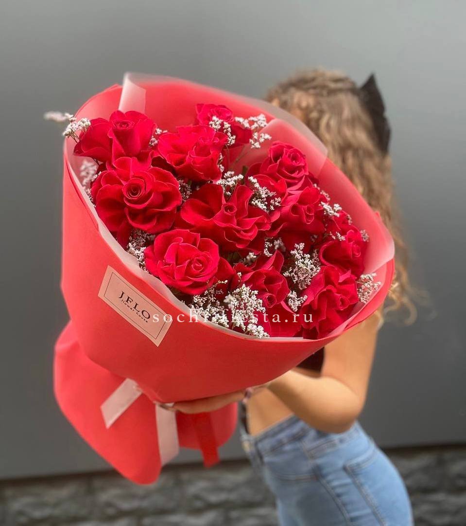 Тридцать пять бутонов с развернутыми лепестками создают насыщенное красное пятно в пространстве. Эвкалипт обрамляет композицию и добавляет воздуха между цветками.