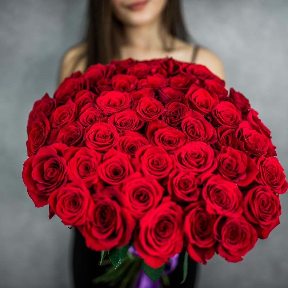 Красный монохром из пятидесяти одной розы притягивает взгляд своей насыщенностью. Крупная композиция заполняет пространство и создает яркое визуальное впечатление.