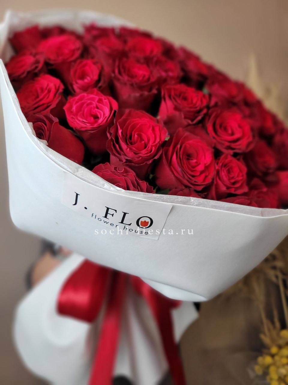 Шестьдесят пять роз образуют пышное облако красного цвета. Объем букета заполняет пространство, создавая мощное визуальное присутствие.