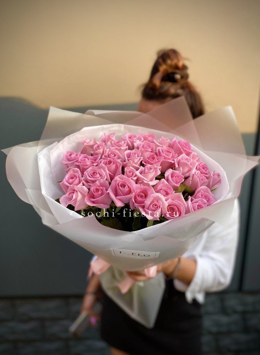 роза розовая - 101 шт., лента, белая дизайнерская бумага.