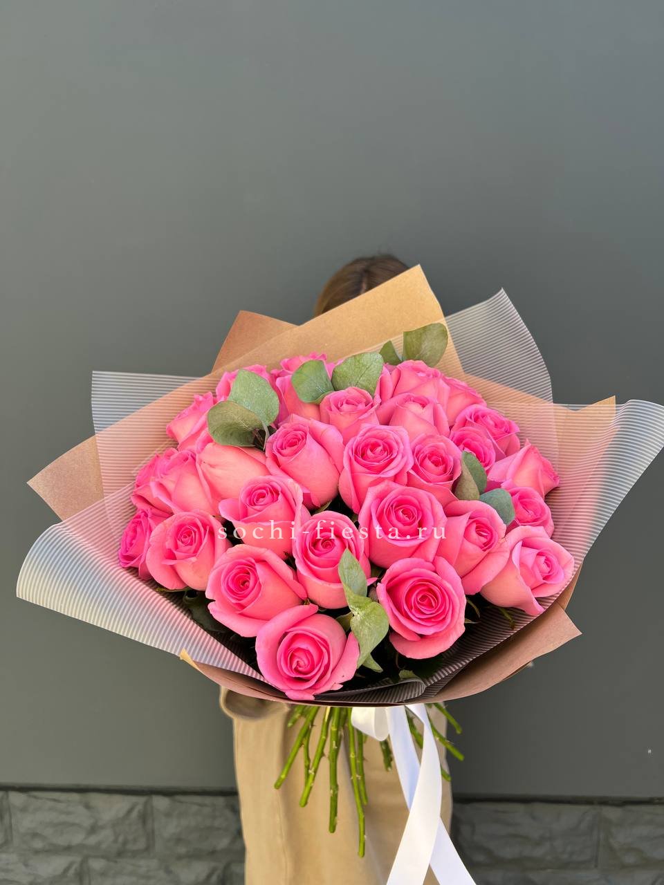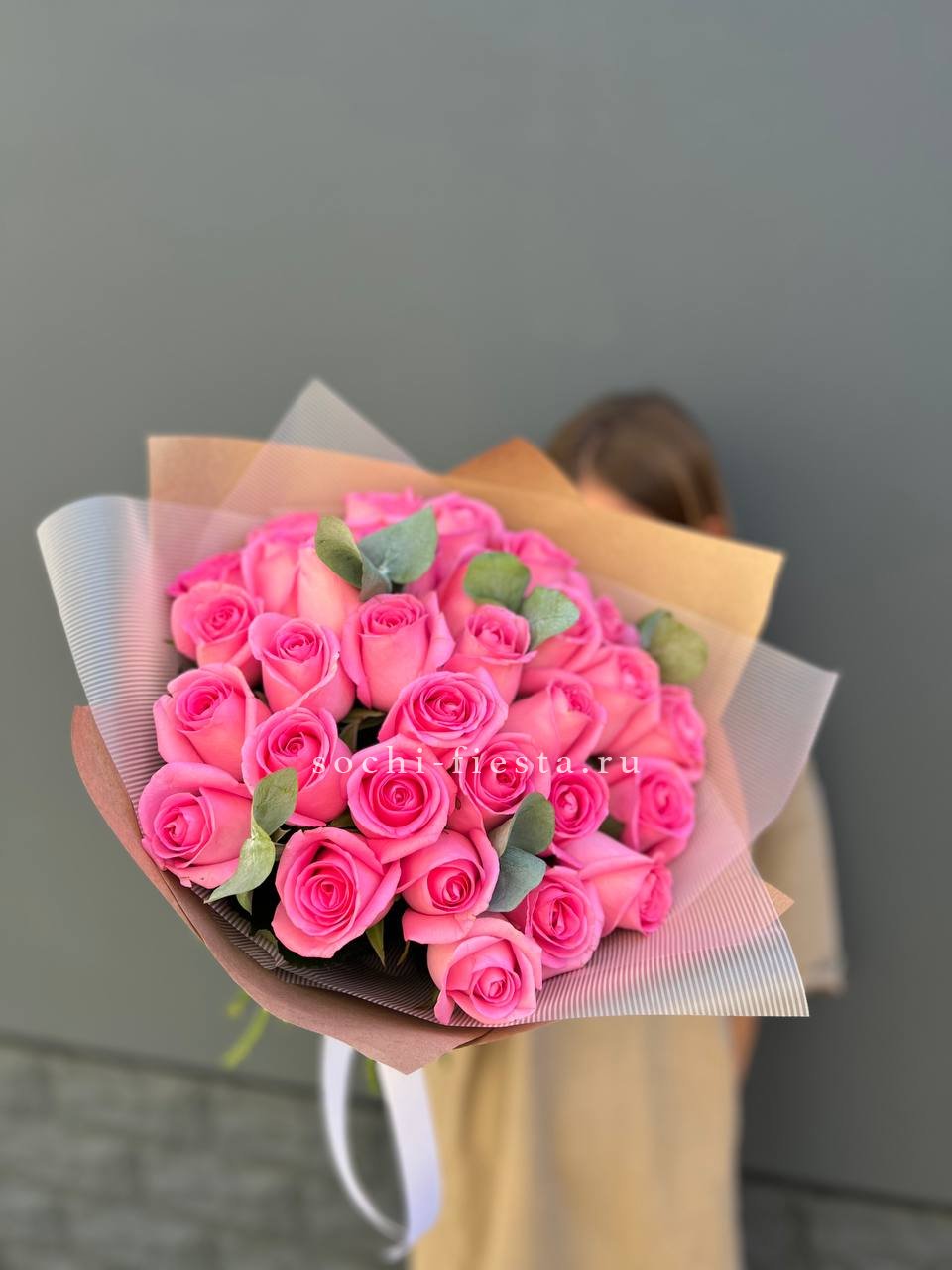 Семнадцать бутонов создают пышный объём и уверенное присутствие в любом пространстве. Розовый тон дополнен матовой зеленью эвкалипта. Букет держит форму и остаётся свежим долгое время.