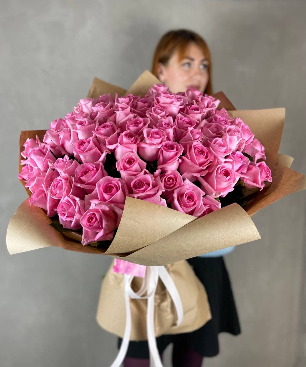 Пятьдесят одна роза собрана в плотный монохромный букет, где каждый бутон создаёт общий объём и глубину. Розовый оттенок раскрывается по-разному в зависимости от света и угла обзора. Композиция впечатляет масштабом и цельностью формы.