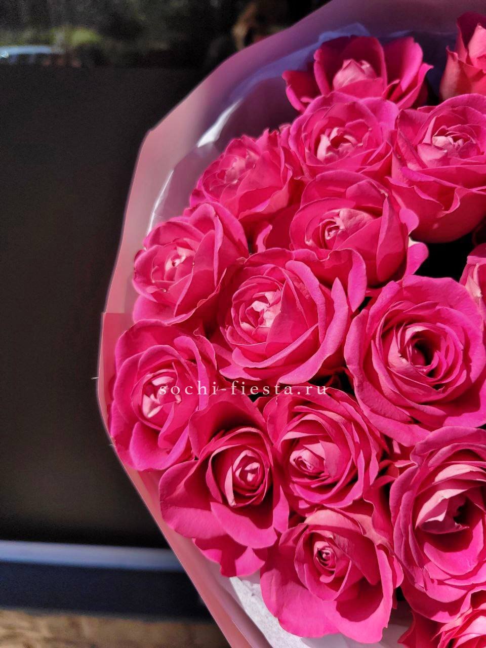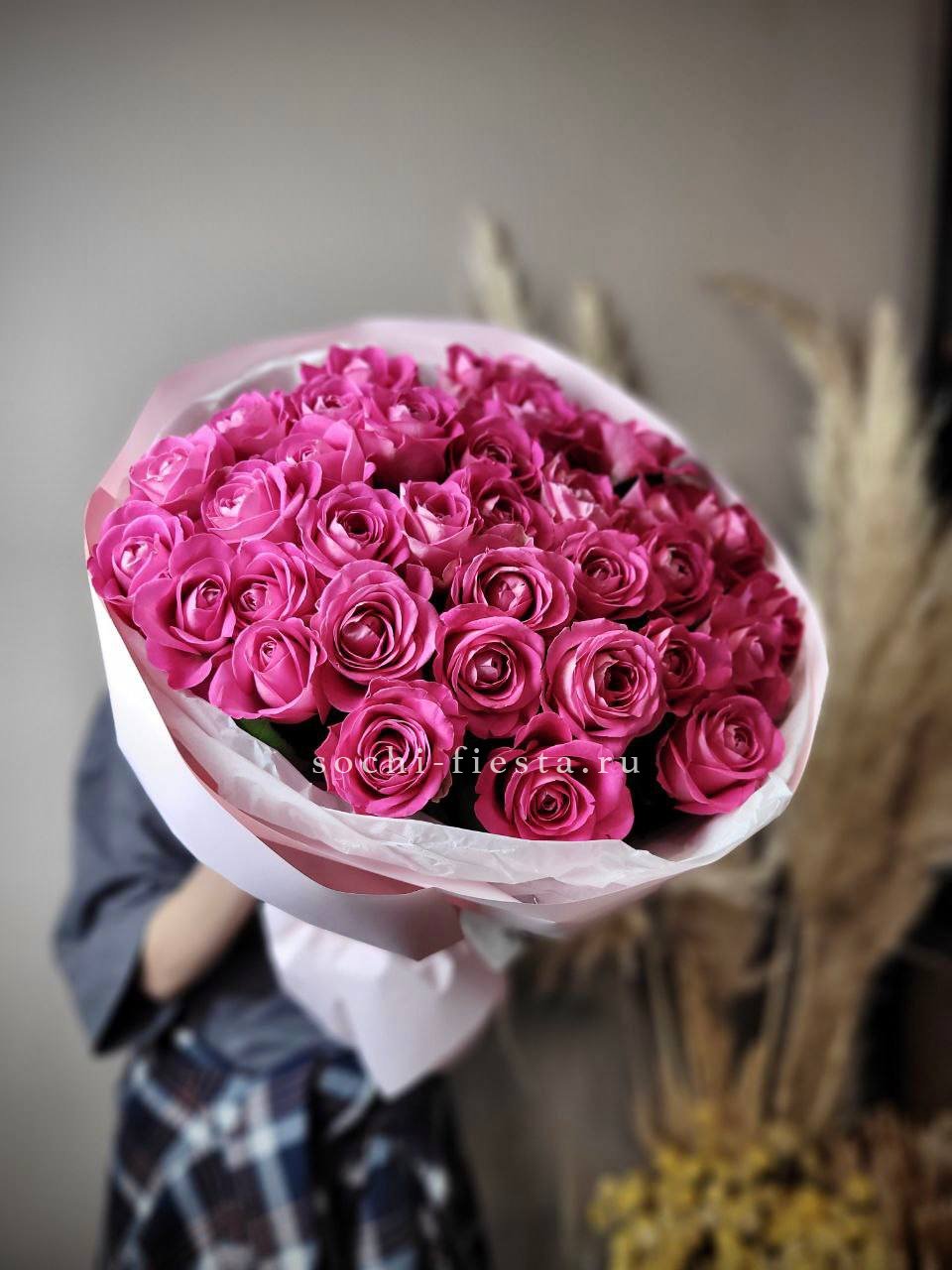розовая роза 21шт., авторская упаковка с ушками.