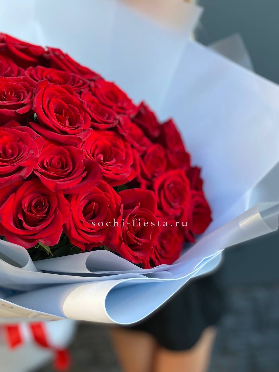 Двадцать пять бутонов выстраиваются в пышную композицию с чётким ритмом и объёмным силуэтом. Голландские розы создают впечатление монументальности и уверенной подачи.