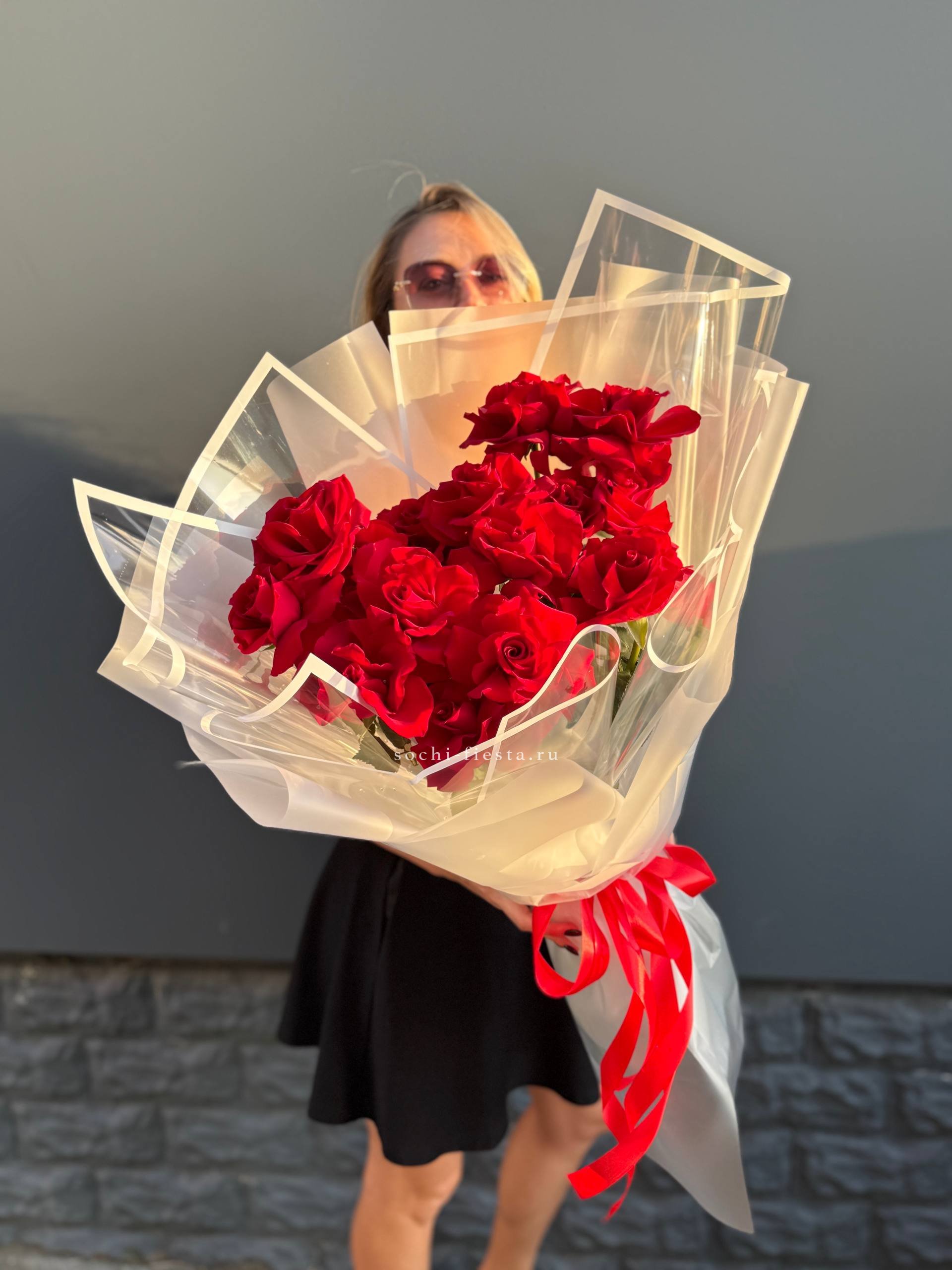 Пятнадцать стеблей собраны в лаконичную форму под прозрачной плёнкой. Букет держит линию и остаётся свежим долгое время благодаря качеству бутонов.