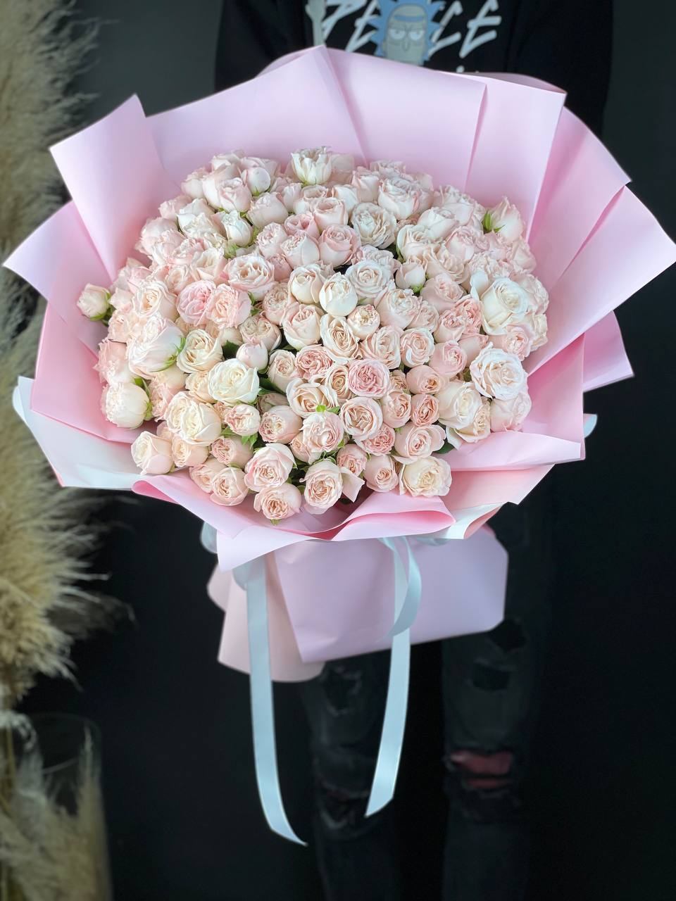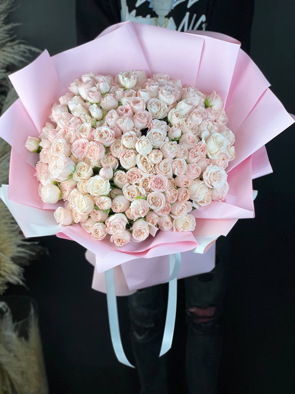 Тридцать пять пионовидных кустовых роз собраны в плетеной корзине и дополнены серебристым эвкалиптом. Округлые бутоны формируют объемную шапку светлых оттенков. Композиция легко размещается на столе и сохраняет форму.