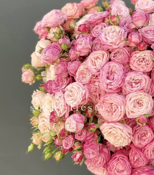 Розовые розы Бомбастик с пышными бутонами образуют воздушную охапку. Цвет переливается от нежного до яркого в зависимости от света. Композиция выглядит живой и естественной.