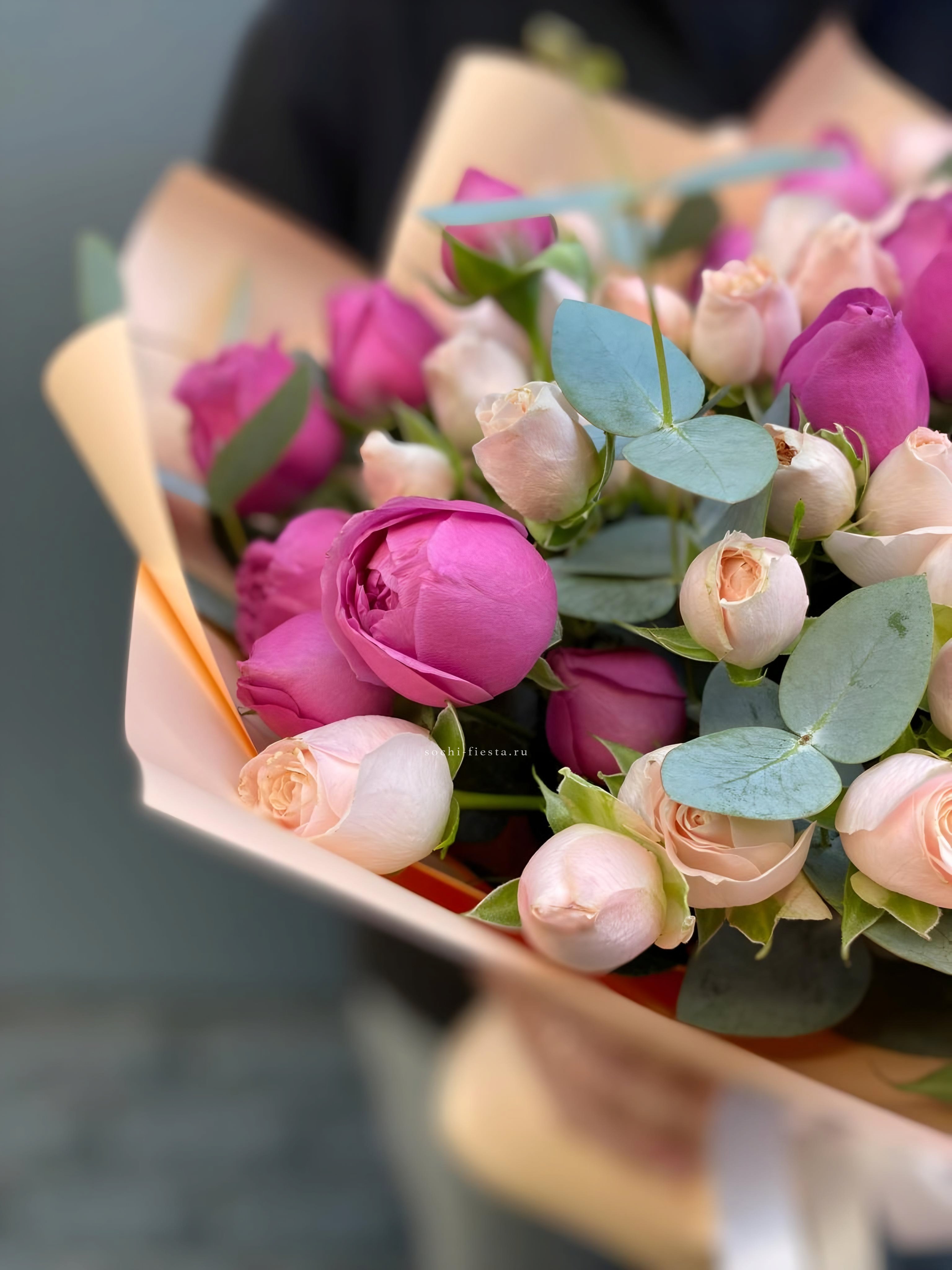 Пионовидные кустовые розы раскрываются пышными шапками, где каждый бутон живет своим ритмом. Многоцветковые стебли формируют воздушный объем, а плотность лепестков дает глубину и визуальную наполненность всей композиции.