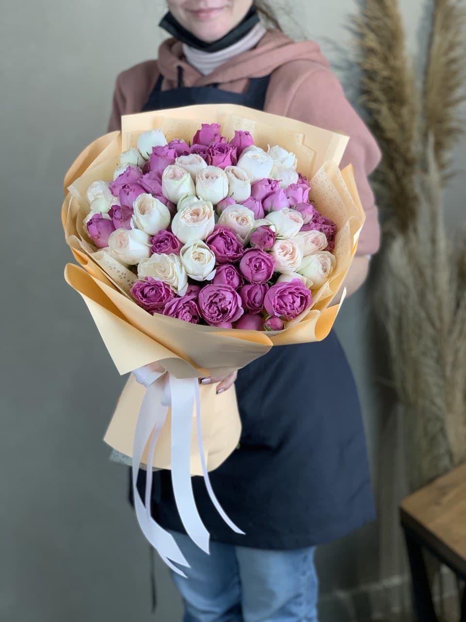 пионовидные кустовые розы, лента, дизайнерская упаковка.