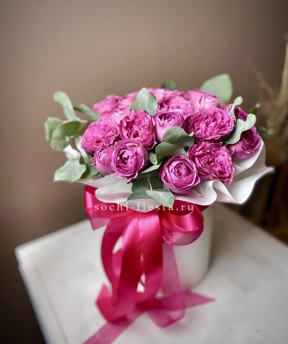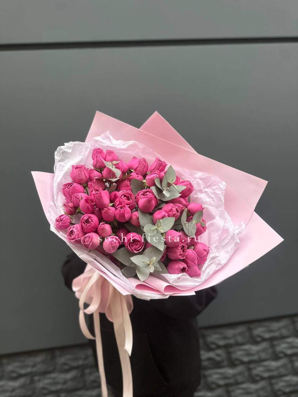 15 пионовидных кустовых роз в сиреневых или розовых оттенках, лента, крафт или другая упаковка на усмотрение заказчика.