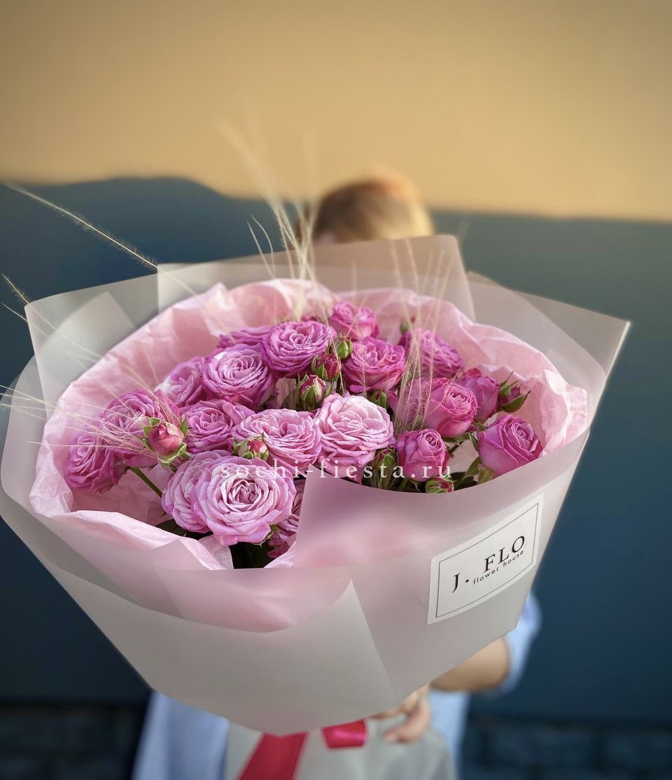 розовые кустовые розы 5 шт., лента, дизайнерская пленка комбинированная.