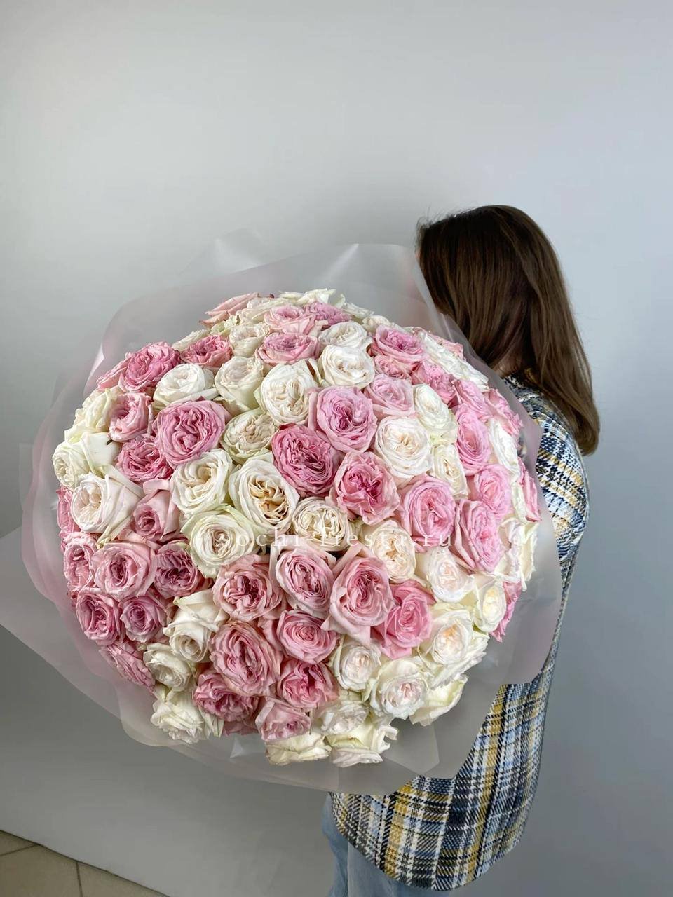 розы пионовидные 21шт, эвкалипт, пленка, лента.