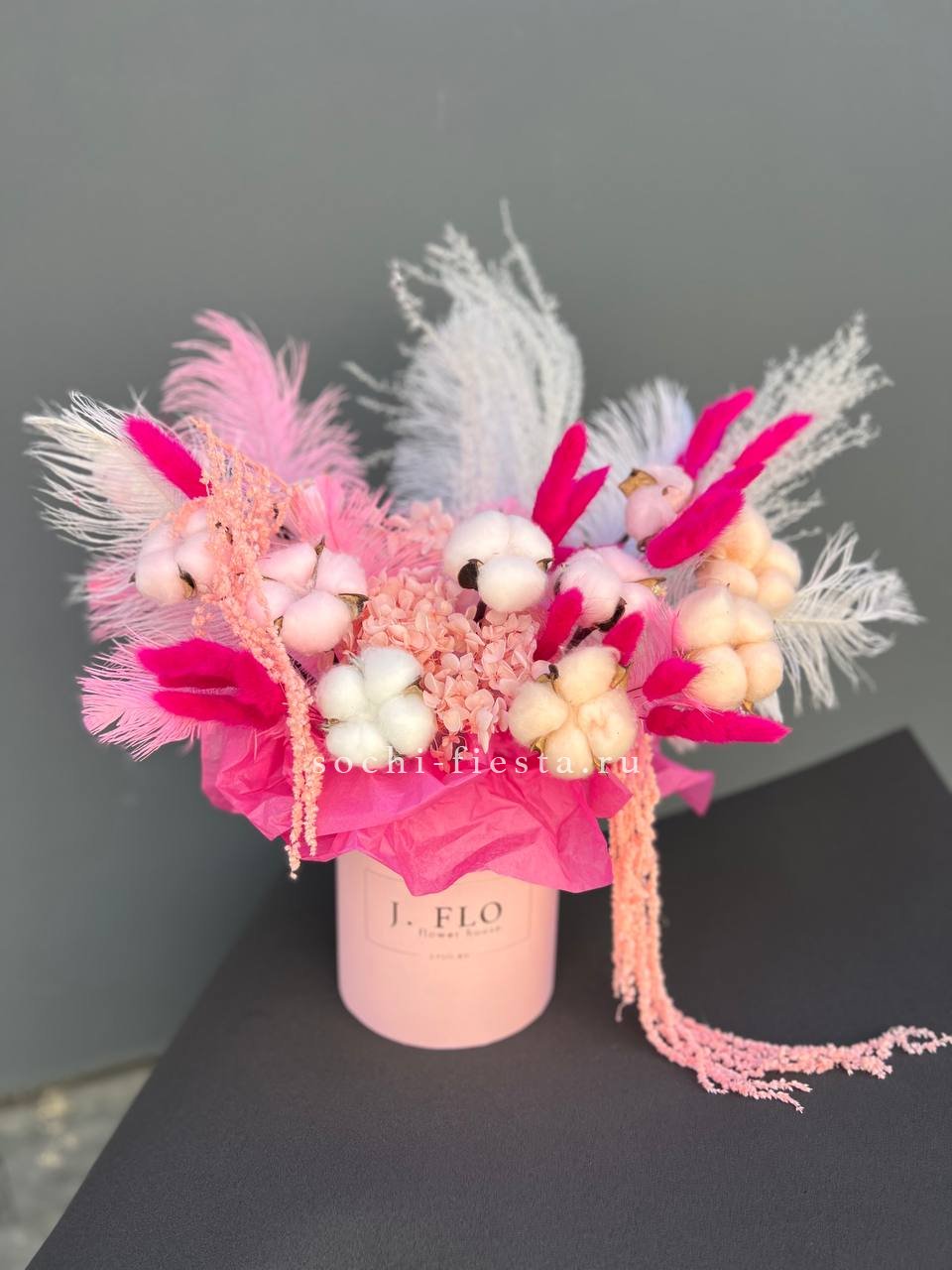 Композиция в цилиндре с лагурусом, хлопком и амарантом создает впечатление природной гармонии. Перья вносят легкость. Удобна в размещении и долго сохраняет первоначальный вид.