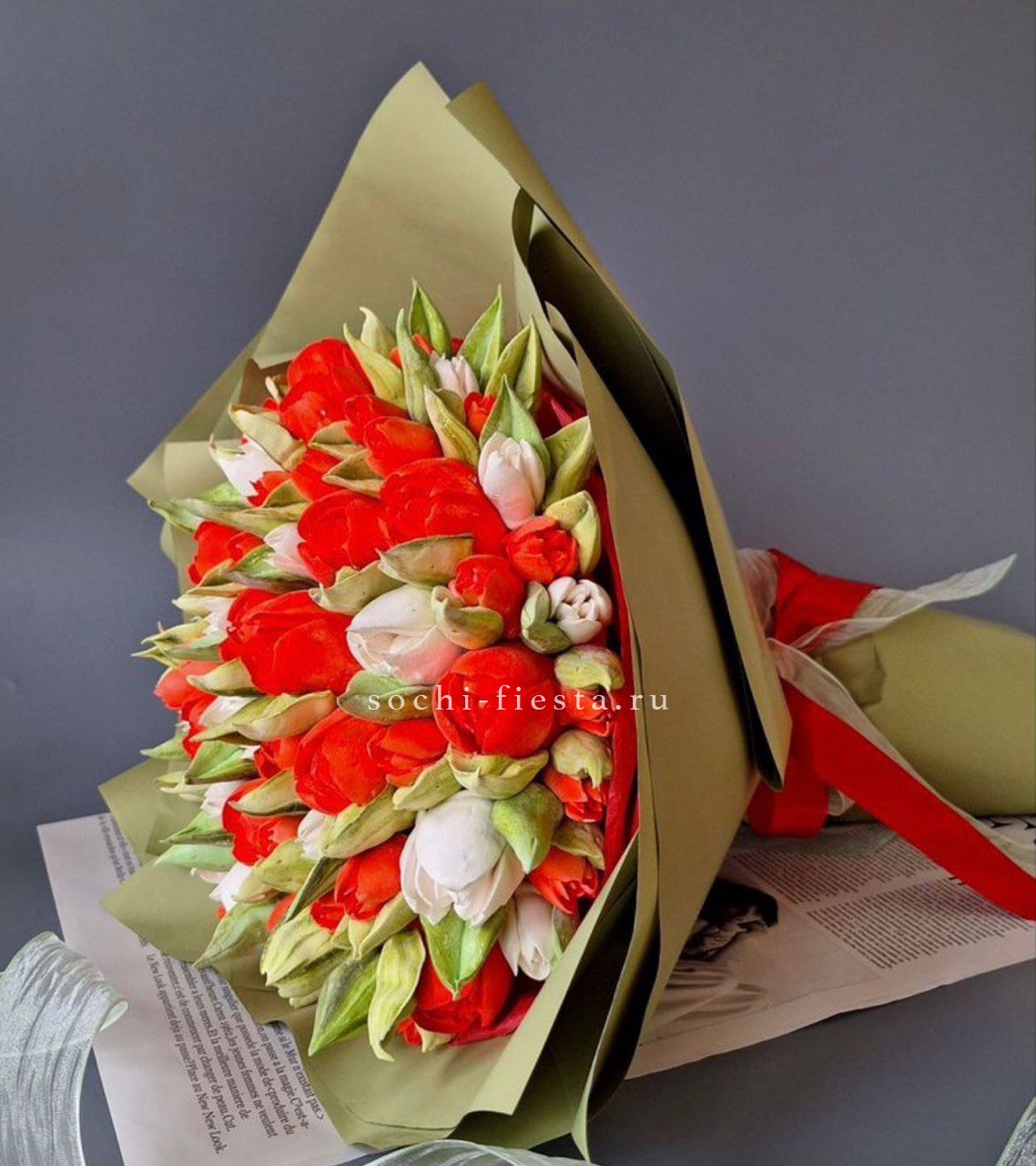 зефир в форме букета тюльпанов (каждый тюльпан выполнен отдельно и собран в букет). Состав: сахар, патока, пектин, агар, яблочное пюре, яичный белок, натуральный краситель, лимонная кислота. Цена за 1букет, размер SX.